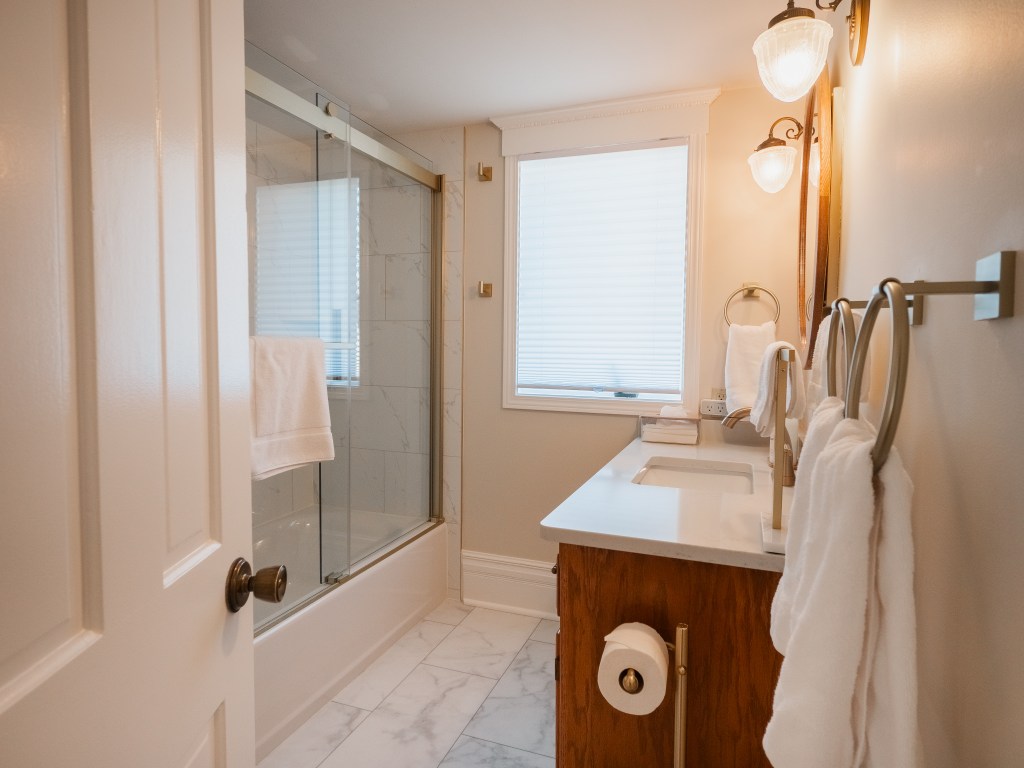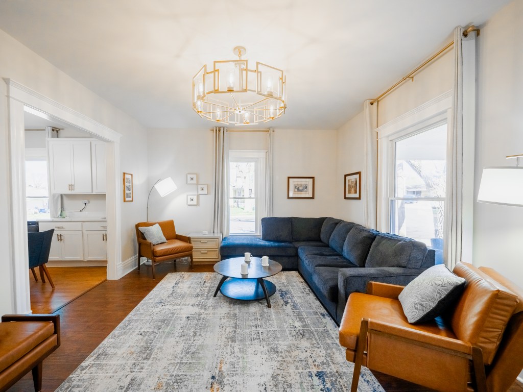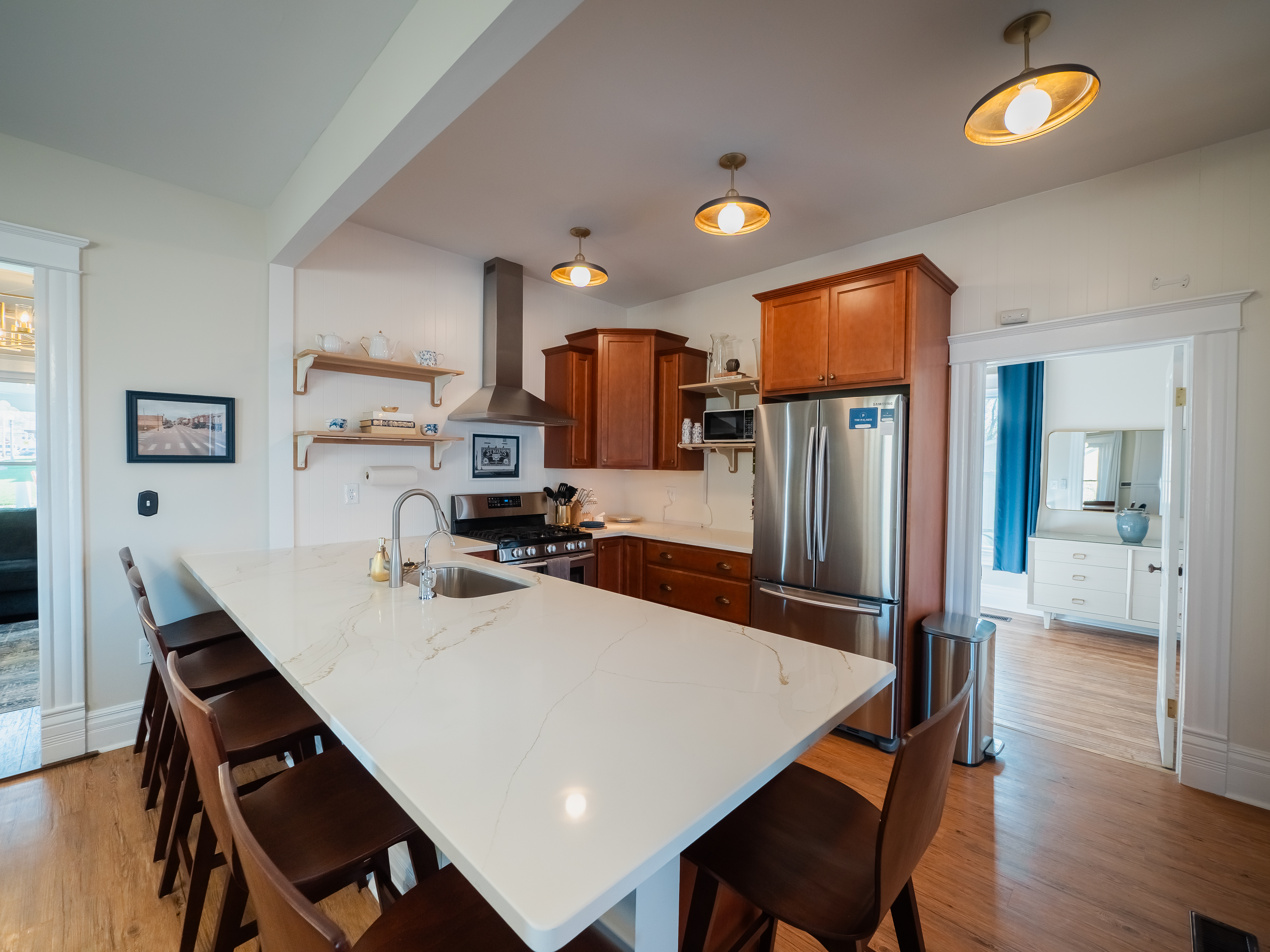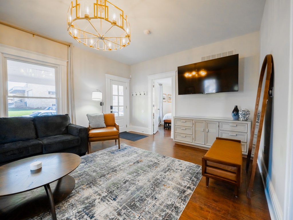 The Palmer has a king bedroom, queen bedroom, and full size pullout sofa, and one bathroom, which is perfect for sleeping six guests for overnight, long weekend, or week-long stays, either as a standalone stay or as an add on to a gathering or event.